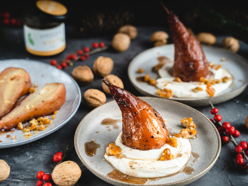 Himmlisches Dessert mit Glühwein, wärmendem Honig und sahnig-cremigem Joghurt. Die Birnen versüßen Ihnen die kalte Jahreszeit.