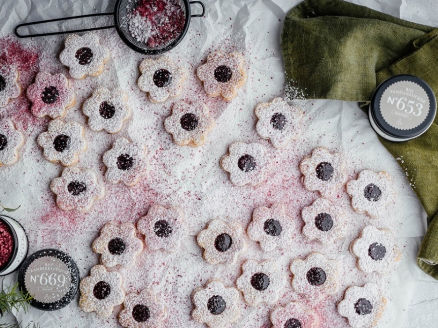 Traumhaft! Der fruchtige Cranberry-Puderzucker hüllt unsere Spitzbuben in eine rosafarbene Wolke. Wir haben uns für Kirschkonfitüre entschieden, aber da können Sie natürlich variieren – rotes Johannisbeergelee, Aprikosen- oder Himbeerkonfitüre sind auch eine gute Wahl.