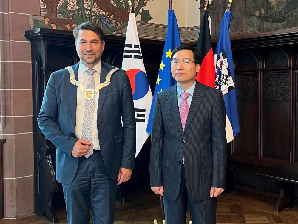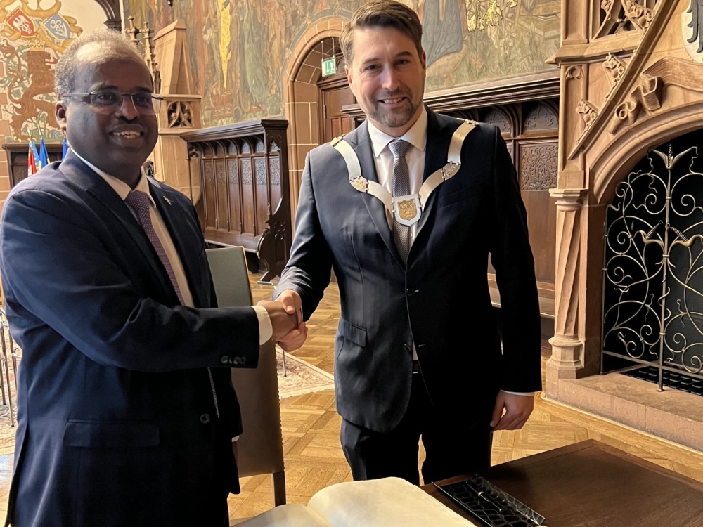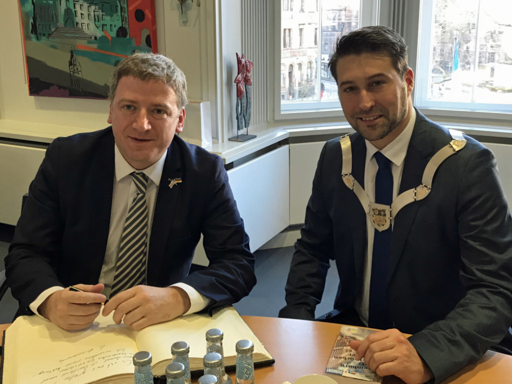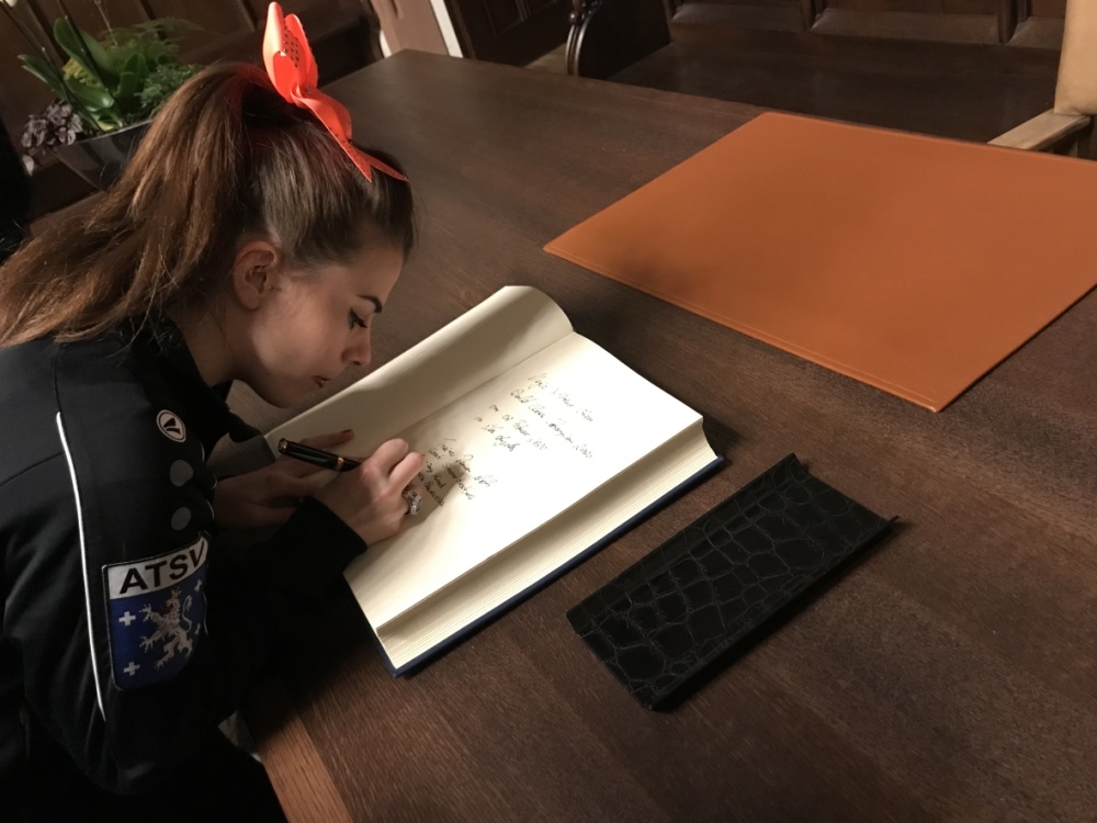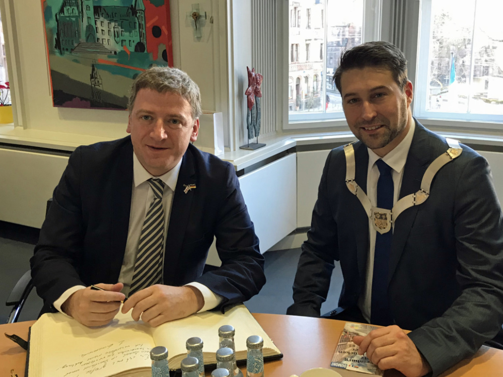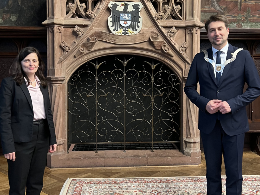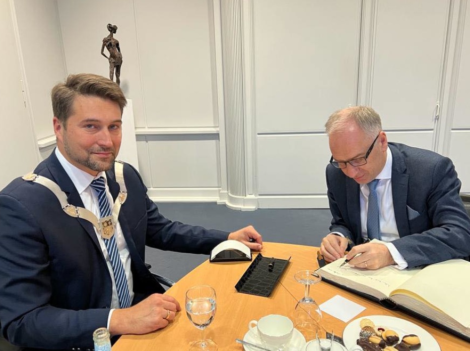 Der Botschafter von Bulgarien, S.E. Grigor Porozhanov, und die Generalsekräterin Diana Popova haben sich bei ihrem Besuch im Saarbrücker Rathaus am 28. Januar in das Goldene Buch der Stadt eingetragen - LHS