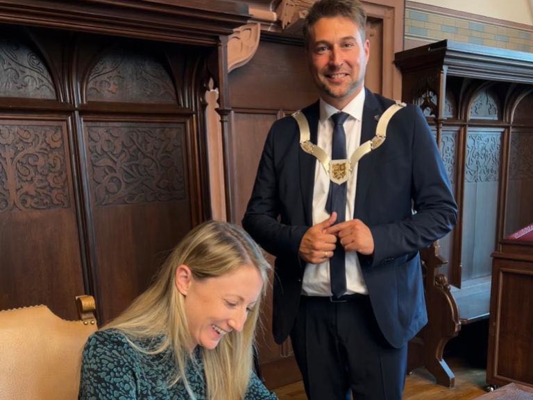 Oberbürgermeister Uwe Conradt lädt kulturelle und gesellschaftliche Gäste der Landeshauptstadt dazu ein, sich in das Gästebuch der Landeshauptstadt einzutragen.