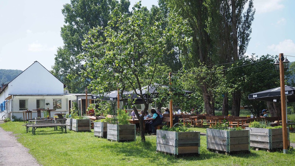 Un biergarten très joliment aménagé, avec bar et barbecue, tout près du chemin de halage qui longe la Sarre et en face de la centrale électrique. Il est équipé de tables et de bancs de style guinguette, mais aussi de chaises, le tout avec des coussins. Il y a également des WC sur place. Il se prête notamment aux fêtes d’anniversaire, mariages et fêtes d’entreprise. Bon rapport qualité-prix.