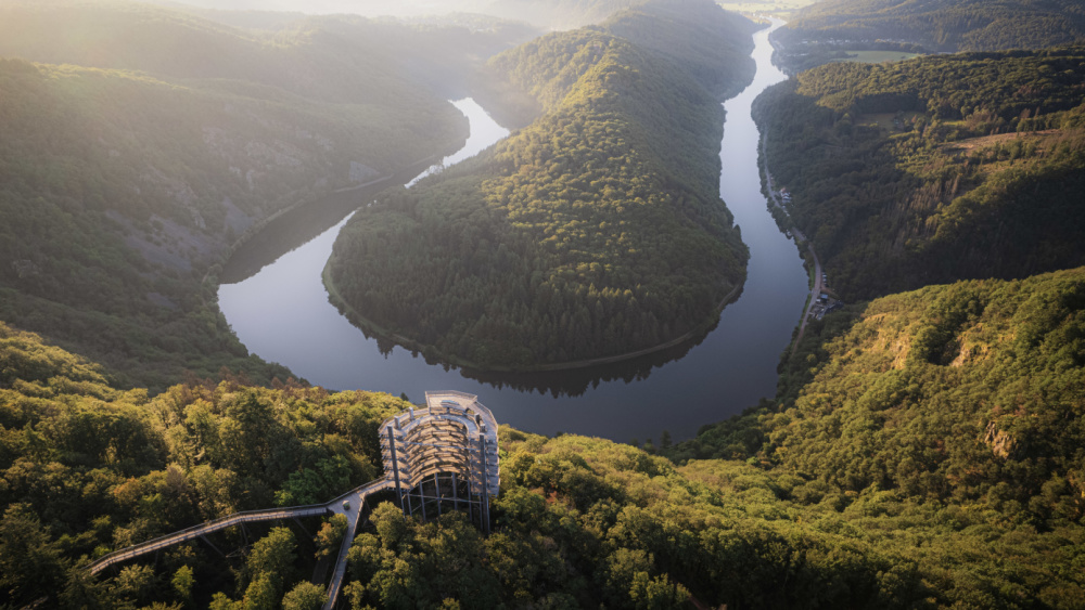 Oberhalb der Cloef schlängelt sich der 1.250 Meter lange barrierearme Baumwipfelpfad durch den Wald und mündet in einen 42 Meter hohen Aussichtsturm. Dort erwartet die Besucher ein unvergessliches Erlebnis: der einzigartige Panoramablick auf die Saarschleife und die umliegende Landschaft.