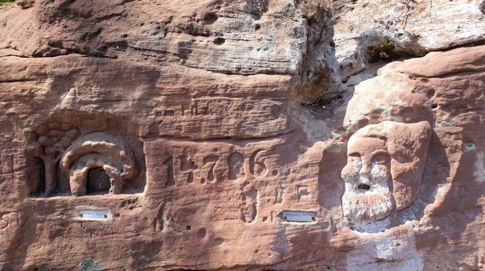 Riesige Buntsandstein-Formationen, schroffe Felswände mit grünen Moos-Vorhängen und eingeritzten Reliefs, Grotten und Schluchten: