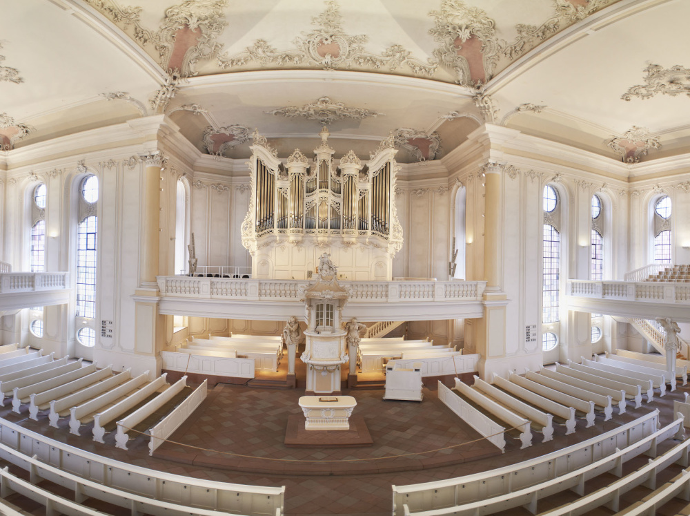 It is considered to be one of the most stylistically and aesthetically perfect Protestant baroque churches in Germany, comparable to the Michel in Hamburg or the Frauenkirche in Dresden. Together with the Ludwigsplatz square, the surrounding palace and civil servants' houses, it is part of a unique baroque ensemble completed in 1775. After being completely destroyed during WWII, the church and palace were meticulously and authentically restored. Looking down Wilhelm-Heinrich-Strasse, you have a direct view of the opposite bank of the Saar, a further example of the visual concepts typical to Stengel's architecture.